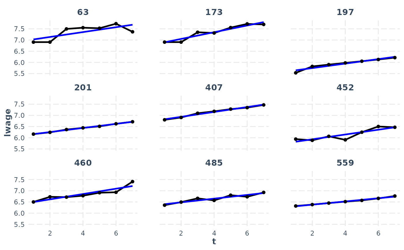 line_plot(wages, lwage, add.mean = TRUE, subset.ids = TRUE, overlay = FALSE)